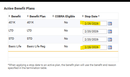 - Enter Stop Dates for any Active Benefit Plans (if different from Termination Date).