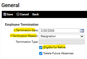 NOTE: Marking an employee as "not eligible for rehire" will not prevent you from being able to rehire them in the future. It will simply produce a warning message as a reminder of this selection.