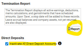 - You can choose to Inactivate All Direct Deposit Accounts if you would like any final payments to be made via live check only, otherwise leave box unchecked.
