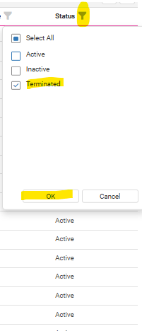 Terminated employees are removed from the Active Employee List, however, their information remains in isolved. To access terminated employees from Employee List, click the filter icon next to Status heading, check Terminated, and click OK. The list will update with terminated employees.